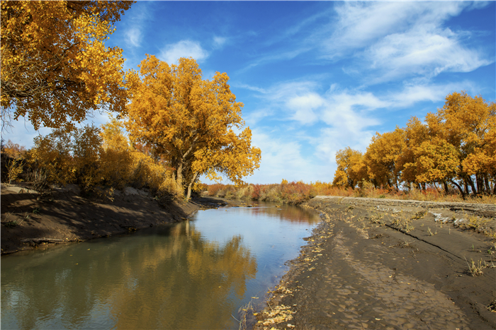 望桿傲立胡楊樹,逾萬(wàn)年難腐??村\繡金黃,彩袂飄飄,持練當(dāng)空舞。