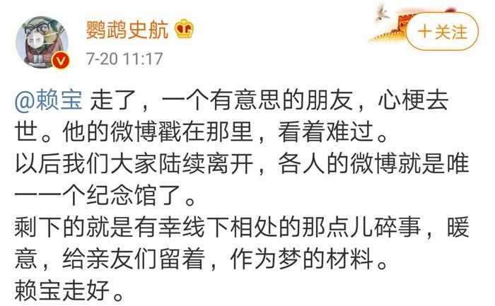 “以后我們大家陸續(xù)離開,各人的微博就是唯一一個紀(jì)念館了。剩下的就是有幸線下相處的那點兒碎事,暖意,給親友們留著,作為夢的材料。賴寶走好。”史航寫道。?