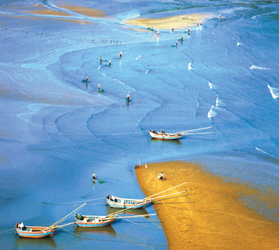 功夫不負有心人。經過漫山遍野地毯式的尋覓,鄭德雄一行把霞浦海灘的拍攝點摸了個遍,也拍出了一幅幅漂亮的好作品。那照片上的霞浦真是美?。核{色的海水,金色的沙灘,種海帶的竹竿依序林立,滿載的漁船停泊在靜靜的港灣,趕海人背著沉甸甸的魚簍,正走在金色的沙灘上……