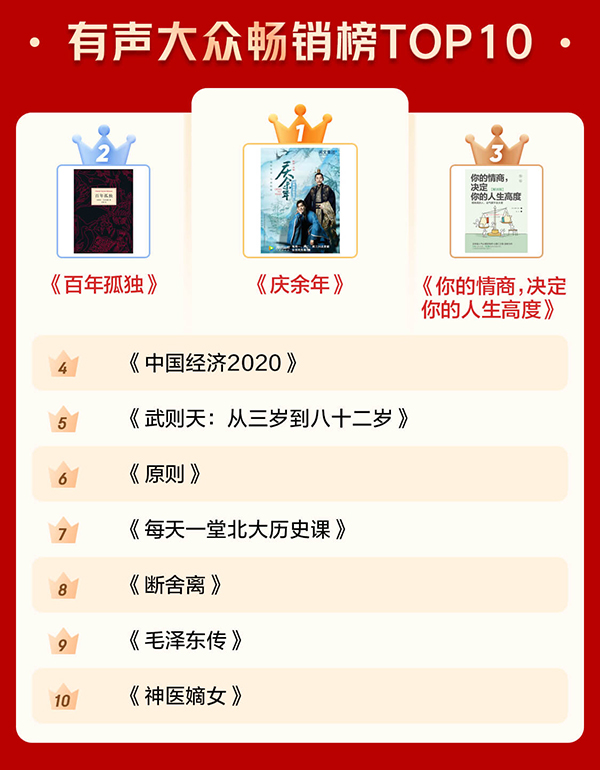 隨著大IP改編影視劇的熱度逐年升高,影視劇原著小說(shuō)也越來(lái)越成為數(shù)字閱讀中最暢銷(xiāo)的書(shū)籍類(lèi)型。其中,《慶余年》隨著電視劇的火爆和《慶余年2》原班人馬即將開(kāi)拍帶來(lái)的熱議流量,其原著小說(shuō)入圍電子書(shū)暢銷(xiāo)榜TOP10和有聲書(shū)暢銷(xiāo)榜TOP10;改編為《沉默的真相》的紫金陳原著小說(shuō)《長(zhǎng)夜難明》則位列電子書(shū)暢銷(xiāo)榜第6名。