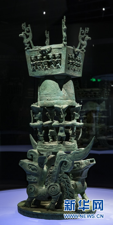 位于四川省廣漢市的三星堆博物館拍攝的出土于三星堆2號“祭祀坑”的青銅神壇。新華社發(fā)