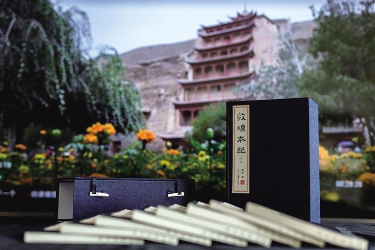 兩個(gè)月后,我如愿以償?!抖鼗捅炯o(jì)》繁體線裝本(限量版)出品,兩函,每函八冊(cè),總計(jì)十六冊(cè),繁體豎排,全手工裝訂。技藝之美,工序之繁,裝幀之考究,未之見過!當(dāng)我打開拿到手上時(shí)肅然起敬,自然會(huì)靜下來,恭恭敬敬翻閱,你能感受到甘肅豐富的歷史文化資源、厚重的文化積淀和波瀾壯闊的滄桑巨變。正是偉大的藝術(shù)和同樣偉大的宗教,在敦煌建筑了人類精神的輝煌莫高窟,人們生活在其中,才擁有現(xiàn)實(shí)人生意義的充實(shí)感和踏實(shí)感。
