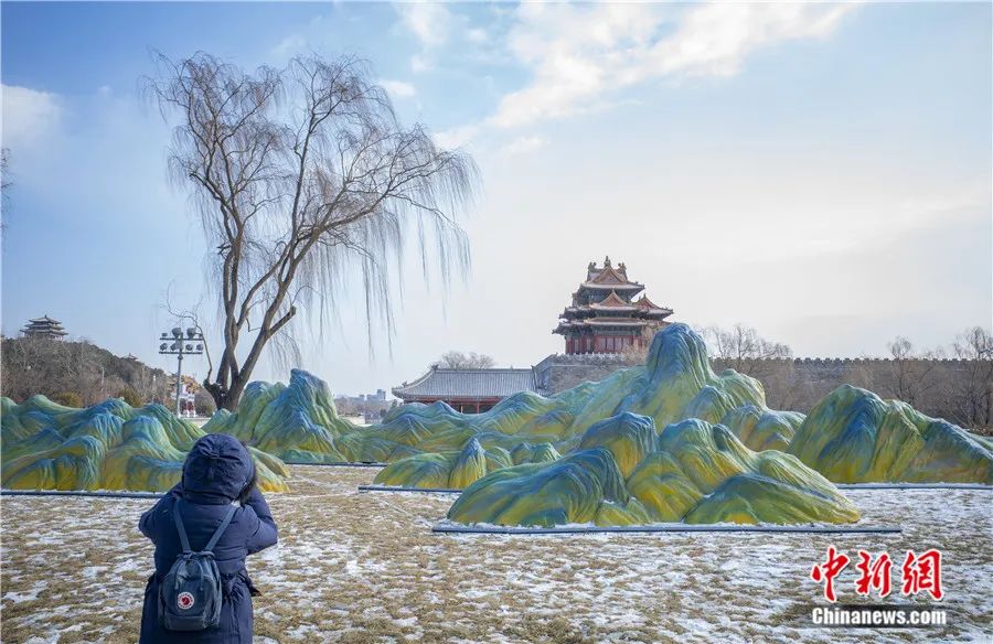 一位市民在北京故宮博物院西北角樓前欣賞“千里江山圖”布景。中新社記者 侯宇 攝