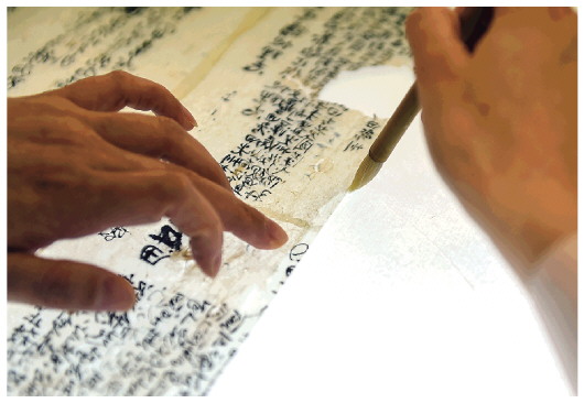 ▲5月17日,在安徽博物院文物科技保護中心紙質(zhì)文物修復室,工作人員對古籍文物進行補全。新華社記者周牧攝