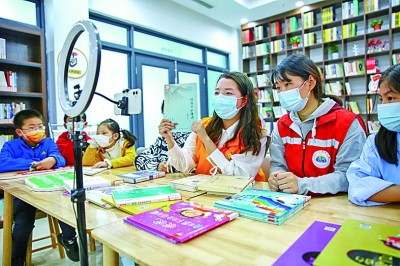 在江蘇如皋市如城街道顧莊社區(qū)農(nóng)家書屋內(nèi),志愿者通過(guò)網(wǎng)絡(luò)平臺(tái)為學(xué)生推薦好書。徐慧攝/光明圖片