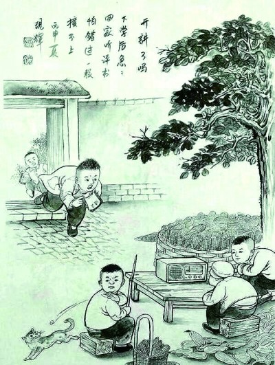 觀賞這一套畫作,好像打開(kāi)了一整座童年生活的博物館,館藏格外豐富和詳盡,玩耍、上學(xué)、家務(wù)、農(nóng)事、年節(jié),林林總總,堪稱極大程度地再現(xiàn)了童年生活的樣態(tài)形貌。不少畫面還具有頗為鮮明的時(shí)代特征,像《派活兒》《滅蝗蟲(chóng)》《地震棚》《送新兵》《備戰(zhàn)麥?zhǔn)铡贰冻龃蹇措娪啊返鹊?,是一份那個(gè)年代農(nóng)村社會(huì)生活的原生態(tài)寫照,文獻(xiàn)的價(jià)值寄寓在生動(dòng)的畫面中。