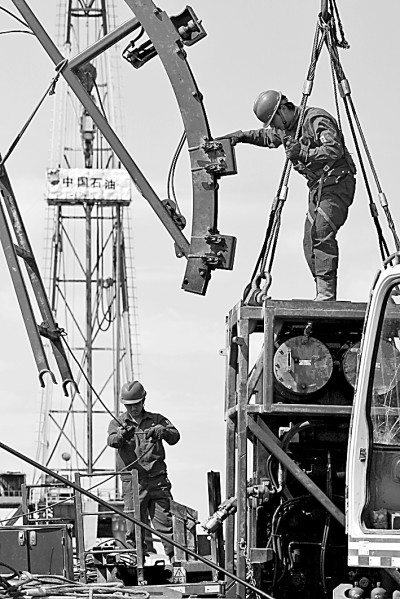 在位于克拉瑪依的新疆油田公司百口泉采油廠(chǎng)瑪湖第一采油作業(yè)區(qū),石油工人正在進(jìn)行測(cè)試作業(yè)。閔勇攝/光明圖片