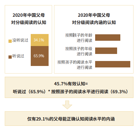 雖然分級(jí)閱讀已經(jīng)成為國(guó)際公認(rèn)的閱讀趨勢(shì),可是,從當(dāng)當(dāng)聯(lián)合艾瑞發(fā)布的《2020年中國(guó)K12階段學(xué)生“分級(jí)閱讀”白皮書(shū)》(以下簡(jiǎn)稱(chēng)《白皮書(shū)》)中,我們發(fā)現(xiàn)中國(guó)大部分父母對(duì)于分級(jí)閱讀尚缺乏認(rèn)識(shí),更談不上有足夠的重視?!栋灼?shū)》指出,有65.9%的父母聽(tīng)說(shuō)過(guò)“分級(jí)閱讀”,而其中真正了解“分級(jí)閱讀”的父母只占45.7%。
