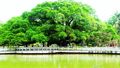 擁有古樹的城市就是擁有歷史的城市。福州古榕遍布,四季常青,是城市、市民生活與樹木的完美結(jié)合,是風(fēng)景的自然生長,是歷史根深葉茂地屹立。福州古榕以樹齡長、歷史久、數(shù)量眾而著稱。見證福州城市史的,當(dāng)首推鼓山國家森林公園、八一水庫旁,福州無人不知的已近千歲,被譽(yù)為福州榕樹王的古榕。相傳,這棵古榕是張伯玉所栽植的兩棵樹苖,光陰荏苒,同氣相求,如今兩棵榕樹相互糾結(jié)、勾連、纏繞、親密,已無分彼此。其冠幅達(dá)1300米,可容納千人在樹下談古論今,聊天遮陰。遠(yuǎn)望,似綠色陵巖;近看,知其為榕也,密密的枝葉把近午的陽光切割成碎花點(diǎn),散落、閃亮在榕樹下的草坪和地衣上。初訪者或?yàn)橛牣悾嘿即笠豢霉砰艆s不見氣根,知榕者會告訴你,這是一株碩大、古老而不生氣根的細(xì)葉榕。因其冠幅日益長大,為了支撐沉重的樹冠、預(yù)防主干折損,便制作了若干石柱,砥柱其間。古榕下有湖塘,錦鯉游泳,不時生出紅色漣漪。旁有一碑,上刻:榕蔭照水波心漾,觀魚猶勝花間行。