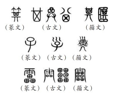 (五)所謂“9353”,指的是《說文》所收全部正篆,即《說文》分析解釋的全部字?!墩f文》收字以篆文為“正”,作為標(biāo)準(zhǔn)字體,這就是許慎所說的“今敘篆文,合以古籀”的收字原則。“今敘篆文”,就是以篆文(小篆)作為標(biāo)準(zhǔn)正字,同時(shí)也會(huì)根據(jù)需要收列部分古文和籀文?!墩f文》所謂“古文”主要是孔子壁中書和民間所獻(xiàn)古文經(jīng)所用的文字,“籀文”即傳為西周晚期太史籀所編字書《史籀篇》上的文字。從《說文》來看,收入的古文、籀文,主要是與篆文有明顯差異的字形。如篆文“箕”“子”“雷”下所收列的古文、籀文: