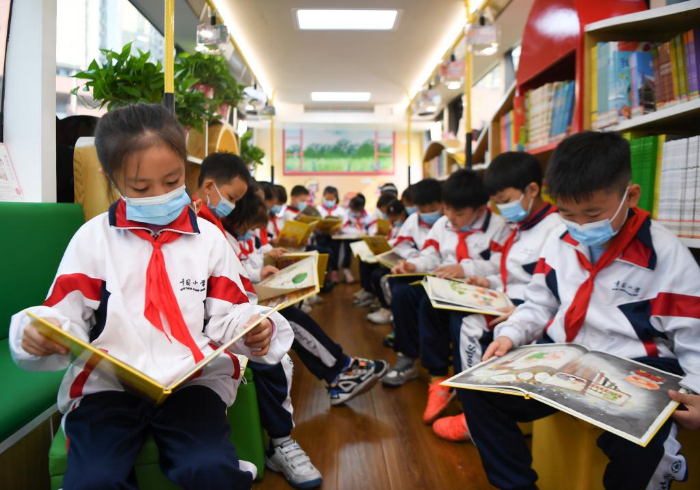 11月10日,學生在長沙市青園友誼小學巴士圖書館內閱讀。