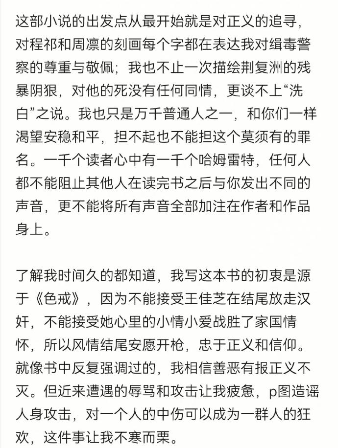 在去年10月14日,疑似《風情不搖晃》的作者在其未經認證的社交媒體賬號上表示,“小說的出發(fā)點是對正義的追尋”。在發(fā)布這條內容后,其賬號再未更新,該條微博也關閉了評論。
