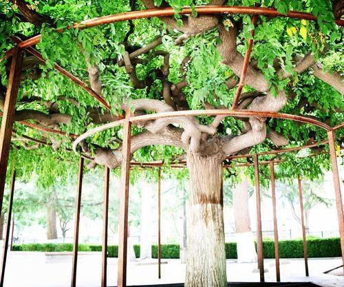 博物館里的這兩棵龍爪槐分別種植在展覽大樓前的東西兩角,是博物館的老專家郭維屏先生所種植。1959年秋冬,甘肅省博物館從通渭路舊館搬遷到七里河的新館,新館內(nèi)一片荒涼,亟待綠化。而就在此時(shí),郭維屏老先生調(diào)入博物館工作,參與到館內(nèi)的綠植規(guī)劃建設(shè),也正好發(fā)揮自己的藝術(shù)特長(zhǎng)。這兩棵龍爪槐的幼株是郭老先生從五泉山苗圃選購(gòu)的,栽種到展覽大樓前院的東西兩角,槐樹(shù)的周圍還設(shè)計(jì)了幾個(gè)形狀不一的花壇,花壇內(nèi)種植了各色各樣的樹(shù)木,一眼望去郁郁蔥蔥,生機(jī)盎然,頗有些韻味。這兩棵龍爪槐剛栽種時(shí)體型嬌小,看起來(lái)很不起眼。經(jīng)過(guò)郭老先生和博物館幾代人的悉心栽培,如今已是樹(shù)冠優(yōu)美,花香四溢。每到槐花盛開(kāi)的時(shí)候,滿庭飄香,沁人心扉,成了博物館里一道靚麗的景色,引得路人駐足欣賞。東角的龍爪槐高約2米,樹(shù)干粗達(dá)2尺多,樹(shù)冠如傘,頂端長(zhǎng)出八、九個(gè)主枝向四面伸展,屈曲盤繞,而后又分為數(shù)十個(gè)中枝和數(shù)百個(gè)小枝,互相攀援,屈折如爪,一枝獨(dú)秀。而西角的龍爪槐因基建的原因長(zhǎng)勢(shì)受到一定影響。