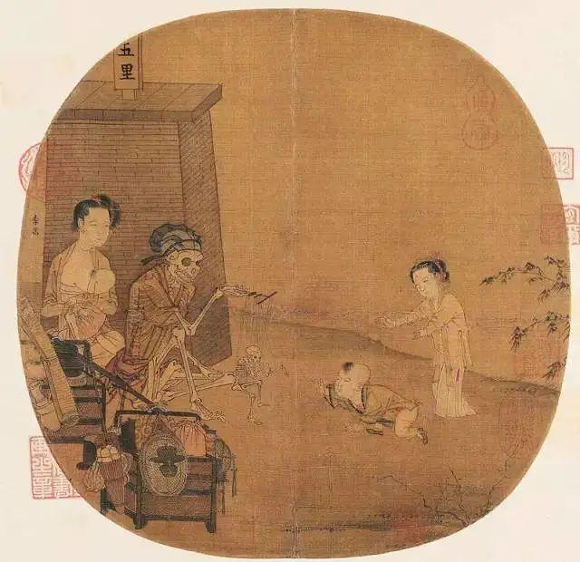 在這幅團(tuán)扇大小的畫(huà)面中,李嵩描繪了一幅傀儡戲的演出場(chǎng)景,一幅披衣戴帽的大骷髏,操縱著線(xiàn)板,指揮著一幅小骷髏在表演各種動(dòng)作。一個(gè)嬰兒好奇地爬向那個(gè)表演中的骷髏小傀儡……活人與骷髏、生與死,同時(shí)出現(xiàn)于畫(huà)面中,在中國(guó)古畫(huà)里是極罕有的,也因此引起了后世的種種猜測(cè)解讀。