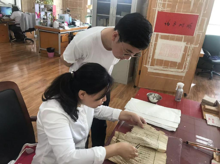 “古籍修復(fù)容不得任何失誤。每一道工序都要小心翼翼、屏息凝神。”王斌說,每拿到一本古籍,修復(fù)師首先要查看并記錄破損情況,同時(shí)制定修復(fù)方案,再根據(jù)方案對古籍進(jìn)行清洗、配紙、修補(bǔ)、錘平、修剪、壓實(shí)、裝訂……整個(gè)過程前后有幾十道繁瑣工序。
