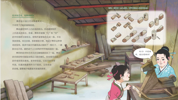 書中提到了在墻面削個角、弄個彎,“拐彎抹角”、方便大家行走的謙讓智慧;齊心協(xié)力,共同出資出力蓋房子的和諧智慧;技術(shù)和藝術(shù)并存,用榫卯聯(lián)結(jié)構(gòu)件的建構(gòu)智慧;防患于未然,保證人們生命、生活安全的防患智慧……