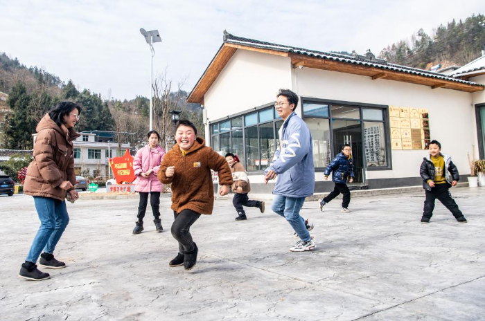 1月24日,在重慶市巫山縣騾坪鎮(zhèn)路口村數(shù)字農(nóng)家書屋外,“臨時(shí)家長”和孩子們一起玩游戲。