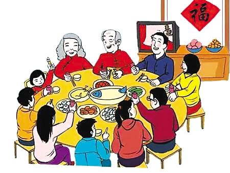 人們辛苦了整整一年,除夕晚上全家老小定要團(tuán)圓,在家中吃團(tuán)圓餃子。餃子形如元寶,取“招財(cái)進(jìn)寶”之意,餃子餡中可以包進(jìn)硬幣和干果,以寄托人們對(duì)新年的一種祈盼。這頓年夜飯可以從傍晚一直吃到天黑,席間人們多彼此祝愿的話語,充滿歡樂溫馨氣氛。