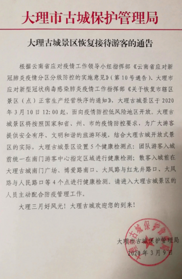 3月9日,云南省大理市古城保護(hù)管理局發(fā)出通告,宣布大理古城景區(qū)于2020年3月10日12:00起,面向疫情防控低風(fēng)險(xiǎn)地區(qū)開(kāi)放。