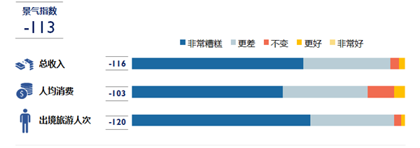 《報(bào)告》指出,受疫情影響,從業(yè)者對(duì)2020年上半年出境旅游市場(chǎng)的整體業(yè)績(jī)預(yù)期極為悲觀。與去年同期相比,景氣指數(shù)大跌113個(gè)指數(shù)點(diǎn),至-113。同時(shí),出境旅游人次、人均消費(fèi)及總收入三項(xiàng)指標(biāo)的市場(chǎng)預(yù)期較2019年上半年均有大幅下滑,其中受疫情于全球蔓延的影響,從業(yè)者對(duì)出境旅游人次的預(yù)期負(fù)面性最高。