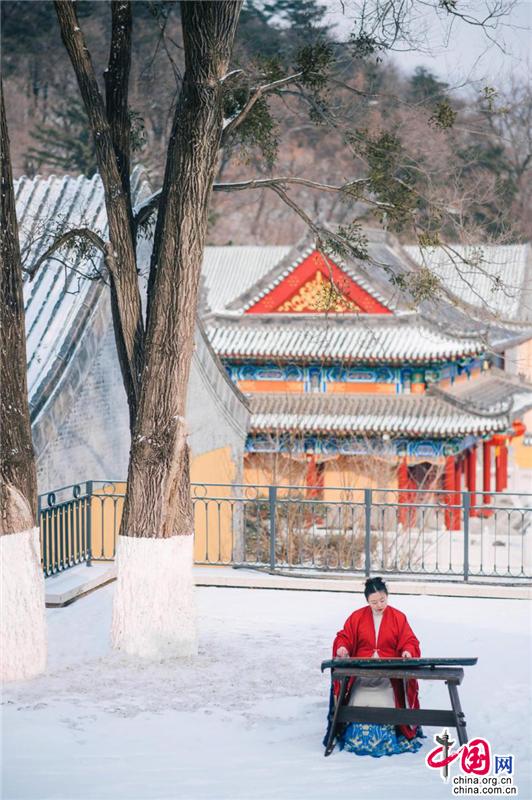 寺廟高處,古榕旁、雪地上,還有另一位古風裝束之人在彈奏古箏,聲意蕭瑟。伴隨空靈的山河意境,飄至遠方。冬季最美的畫面,也不過如此。