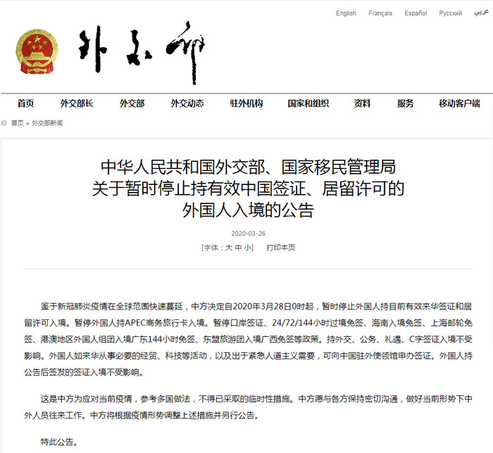 《公告》說,鑒于新冠肺炎疫情在全球范圍快速蔓延,中方?jīng)Q定自2020年3月28日0時起,暫時停止外國人持目前有效來華簽證和居留許可入境;暫停外國人持APEC商務(wù)旅行卡入境;暫??诎逗炞C、24/72/144小時過境免簽、海南入境免簽、上海郵輪免簽、港澳地區(qū)外國人組團入境廣東144小時免簽、東盟旅游團入境廣西免簽等政策。