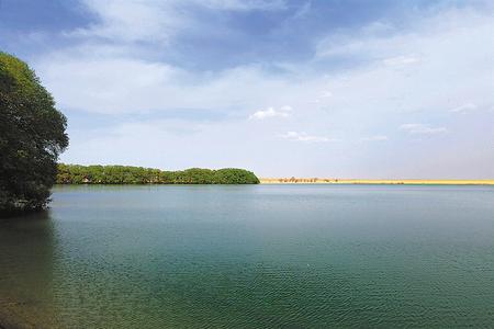 在渥洼池畔舉目遠(yuǎn)眺,在阿爾金山皚皚白雪的映襯下,偌大的渥洼池顯得安靜祥和,廣闊的水域就像一面鏡子,鑲嵌在大漠深處,在陽光的折射下顯得格外深邃而內(nèi)斂。渥洼池畔茂密的灌木林和高大密集的蘆葦蕩,將一汪湖水浸染的泛著黛綠,蘆葦和灌木在湖水滋潤下郁郁蔥蔥,高低錯落有致,大有阡陌縱橫之勢。西岸不遠(yuǎn)處,南北迤邐著一座兩公里有余的沙坡頭,猶如一條盤旋的黃龍,亙在湖水的西邊搖頭擺尾,它曾經(jīng)以每年兩至三米的速度,肆無忌憚地向渥洼池水域逼進(jìn)。不過,在陽關(guān)保護(hù)區(qū)的精心培育下,一片密集的蘆葦,已經(jīng)爬到了沙梁頂上,將這條黃龍死死地鎖在原地,動彈不得。