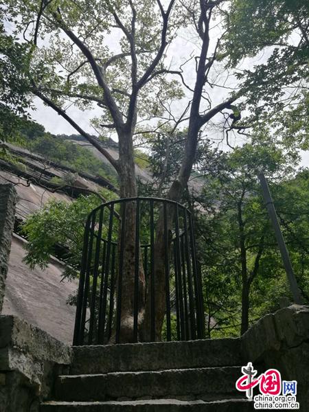 于是,我開始沿著陡峭的石階,一步一步地向上攀登。上不過百余級,一株如巨傘狀的天目紫莖躍然眼前。樹四周用茶杯粗細鋼筋柵欄緊緊圍住,可見景區(qū)對此珍貴名木的重視。仔細觀察,估計樹齡至少在500年以上,其主干樹皮細滑,骨感十足,上部枝丫自然舒展,覆蓋出去,周圍各色綠樹恰似眾星拱月般,與其相擁成趣。