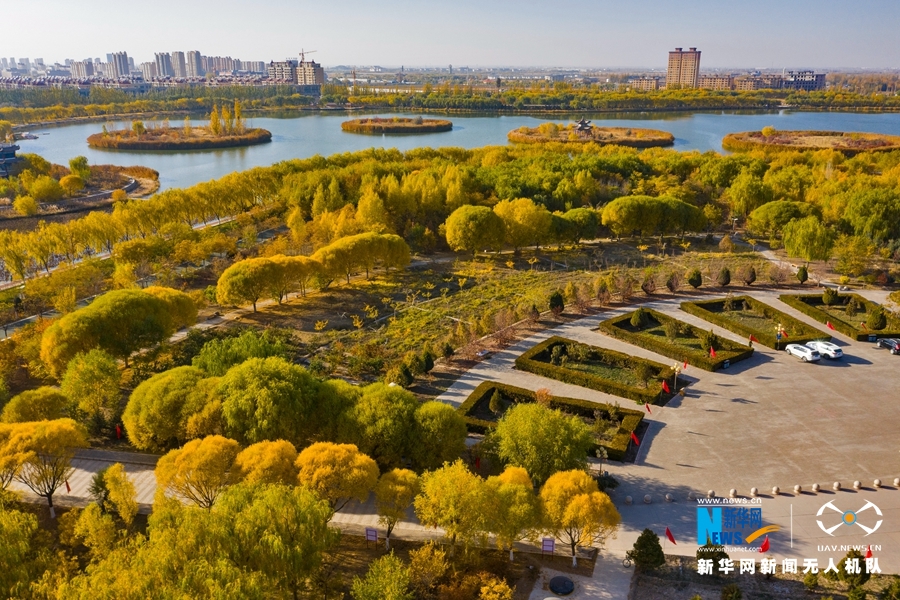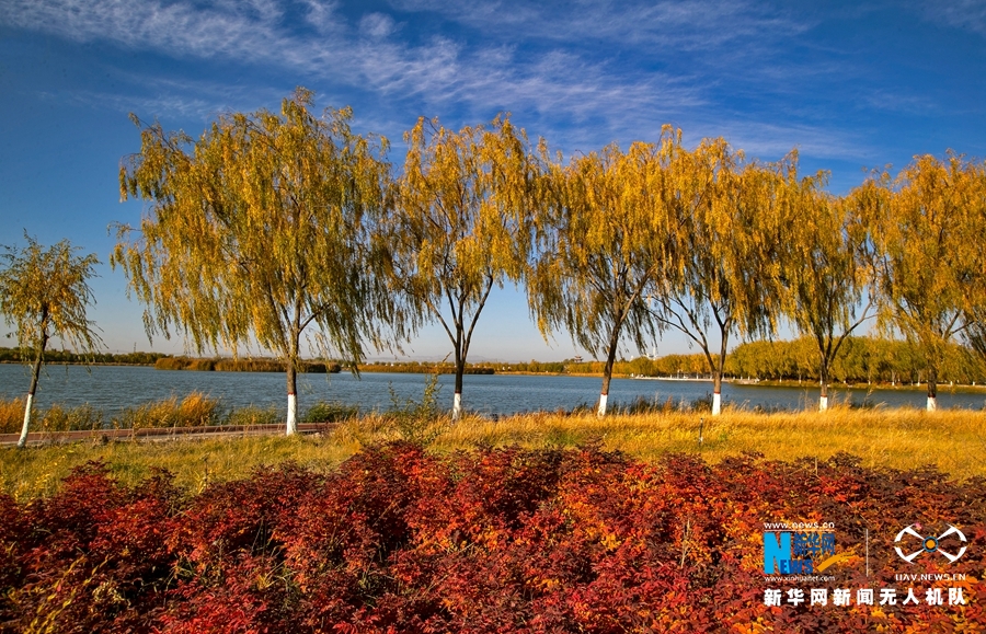 深秋時節(jié),國家4A級景區(qū)甘肅省張掖潤泉湖公園秋水依依,草木金黃,呈現(xiàn)出一幅斑斕畫卷。新華網(wǎng)發(fā)(成林 攝)