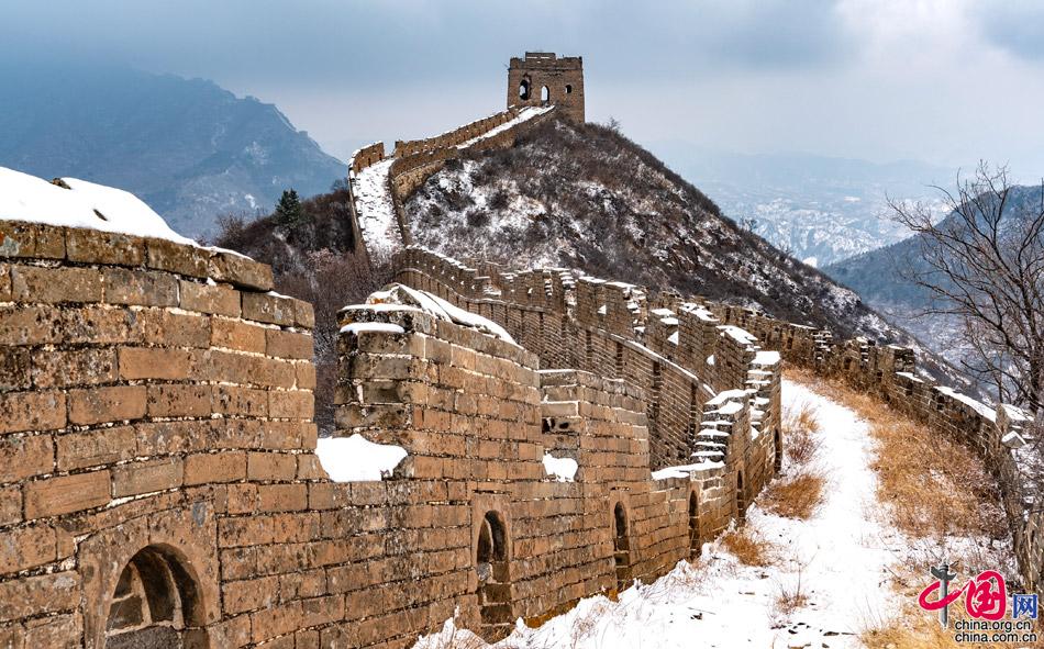 春雪飄灑,一朵朵相擁著落下,氣溫驟降,給人帶來一絲涼意。金山嶺海拔700米,長城依山憑險,起伏跌宕于山水之間,形勢極為雄奇。金山嶺長城是明代修筑的一段長城,西起歷史上著名的關口古北口,東至高聳入云的望京樓,全長10.5公里,沿線設有大小關隘5處,敵樓67座,烽燧2座,因其視野開闊,敵樓密集,景觀奇特,建筑藝術精美,軍事防御體系健全,保存完好而著稱于世。