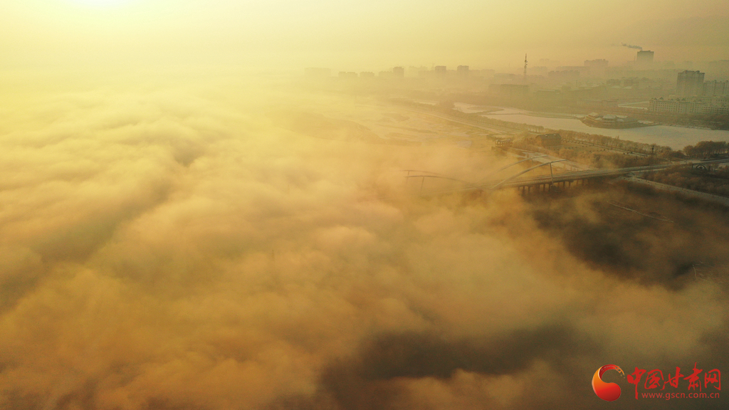 2月8日清晨,甘肅張掖市高臺縣黑河國家城市濕地公園上空霧浪翻滾,虛無縹緲,恍如天宮仙境,呈現(xiàn)出海市蜃樓般的云海奇觀,在陽光的照射下,格外美麗。由于多年來黑河生態(tài)治理,冬天封凍,加之近日大范圍的降雪低溫天氣,黑河的水面上經(jīng)常霧氣蒸騰,兩岸的樹木玉樹瓊花,形成霧凇景觀,如同童話世界里的仙境一般圣潔,令人心曠神怡。