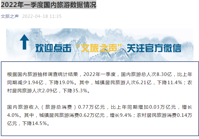 今天,文化和旅游部公布了2022年一季度國內(nèi)旅游數(shù)據(jù)情況。統(tǒng)計(jì)數(shù)據(jù)顯示,2022年一季度,國內(nèi)旅游總?cè)舜?.30億,比上年同期減少1.94億,下降19.0%。其中,城鎮(zhèn)居民旅游人次6.21億,下降11.4%;農(nóng)村居民旅游人次2.09億,下降35.3%。