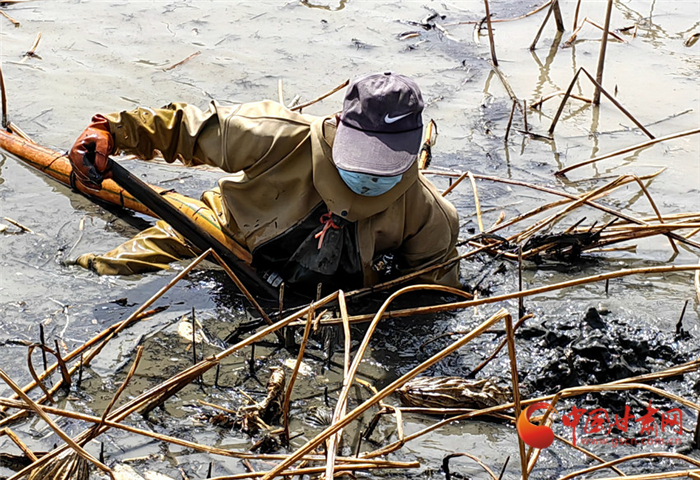 李愛芝是青城鎮(zhèn)東灘村村民,一大早她便和丈夫張興成換好了裝備,進(jìn)入池塘里開始采摘蓮藕。張興成憑著手中高壓水槍“探路”,一步步艱難挪動(dòng),在淤泥里手腳并用尋找肥壯的鮮藕,幾乎整個(gè)身體都是趴在水面上,佝僂著腰,雙手盡力伸入淤泥,張興成的挖藕效率還算不錯(cuò),伴隨著一連串嫻熟的動(dòng)作,不一會(huì)兒,一根根粗大的蓮藕漂浮在他身旁的水面上,李愛芝則將蓮藕身上的淤泥清洗干凈后裝拉回岸邊進(jìn)行分裝。