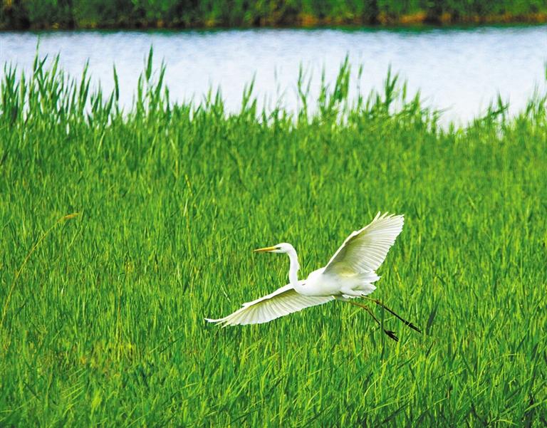 初夏的甘肅張掖國家濕地公園蘆葦青青,幾只白鷺在綠色的蘆葦中時而嬉戲飛翔,時而駐足覓食,成為濕地一道美麗風(fēng)景。 人民網(wǎng)照片