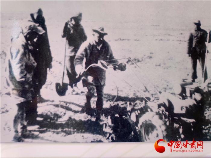 上個世紀40年代,山丹四壩灘上,山丹培黎學校農(nóng)業(yè)組的學子在種地中學習,還實施了灌溉引水澆地。