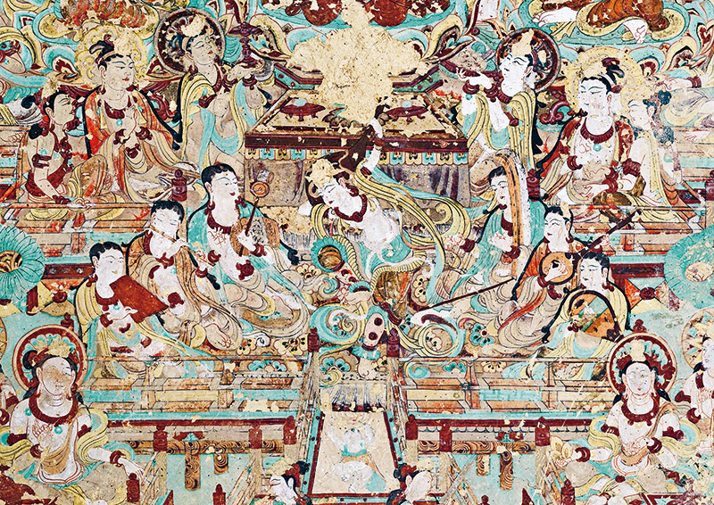 敦煌文化延續(xù)近兩千年,是世界現(xiàn)存規(guī)模最大、延續(xù)時間最長、內容最豐富、保存最完整的藝術寶庫,是世界文明長河中的一顆璀璨明珠,也是研究我國古代各民族政治、經(jīng)濟、軍事、文化、藝術的珍貴史料。圖為莫高窟第112窟南壁壁畫“反彈琵琶樂舞圖”?!《鼗脱芯吭汗﹫D