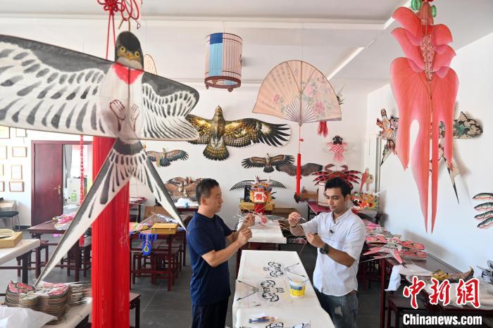 巴基斯坦籍留學(xué)生烏瑪爾(右)跟隨第什里風(fēng)箏第五代傳承人趙艷強(qiáng)(左)學(xué)習(xí)傳統(tǒng)風(fēng)箏制作?!〉杂鸺?nbsp;攝