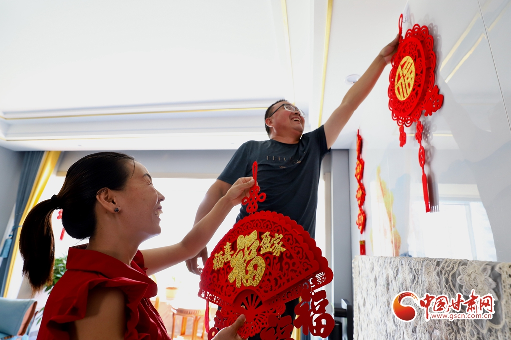 8月30日,張掖市民樂(lè)縣搬遷到樂(lè)民新城新居的一家人正在墻上掛福字。