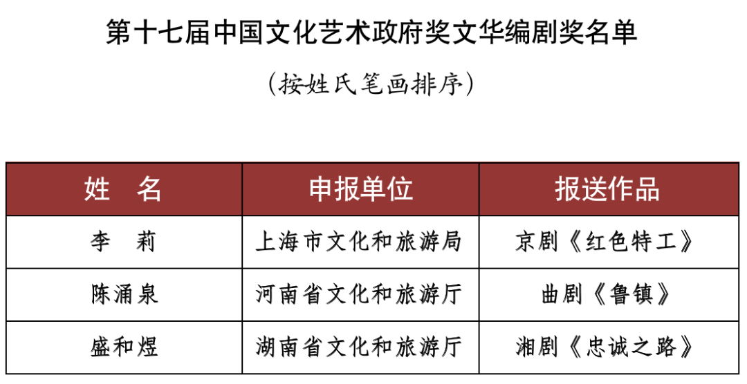 9月15日,文化和旅游部對外公布了《第十七屆文華獎獲獎名單》。舞劇《五星出東方》(北京市文化和旅游局選送)、話劇《塞罕長歌》(河北省文化和旅游廳選送)、舞蹈詩劇《只此青綠》--舞繪《千里江山圖》(中國東方演藝集團有限公司選送)等15個作品獲得第十七屆中國文化藝術政府獎文華大獎。
