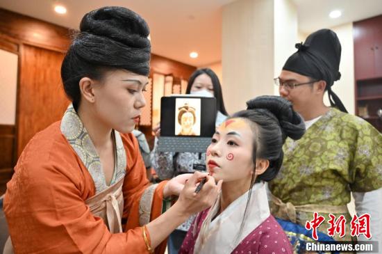 10月9日晚,廣西南寧市一攝影棚內(nèi),南寧傳統(tǒng)服飾復(fù)原團(tuán)隊(duì)化妝師鄭若楠依據(jù)陶俑文物圖片為模特上面妝。