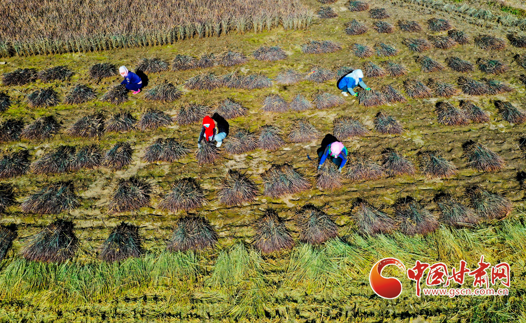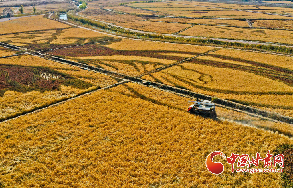 10月21日,位于祁連山下的甘肅省張掖市甘州區(qū)烏江鎮(zhèn)新河田園綜合體內,農(nóng)戶們正在收割成熟的高原水稻。