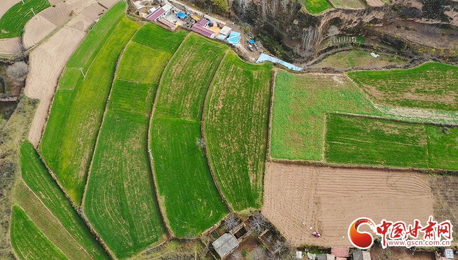 初冬時(shí)節(jié),平?jīng)鍪谐缧趴h錦屏鎮(zhèn)農(nóng)田里冬小麥長(zhǎng)勢(shì)喜人,從空中俯瞰,給田野鋪上了綠色的地毯。