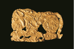 【虎噬羊紋金飾片·戰(zhàn)國(guó)·清水縣劉坪出土】工藝技法采用常見的錘碟法,在薄的金片的背面鏨刻虎形,正面隆起,邊緣剪切,四角有釘孔?;⒊识拙嵝?,眼、鼻、耳、嘴、齒、爪都十分清晰,虎張嘴,伸溝狀前爪抓住一羊。