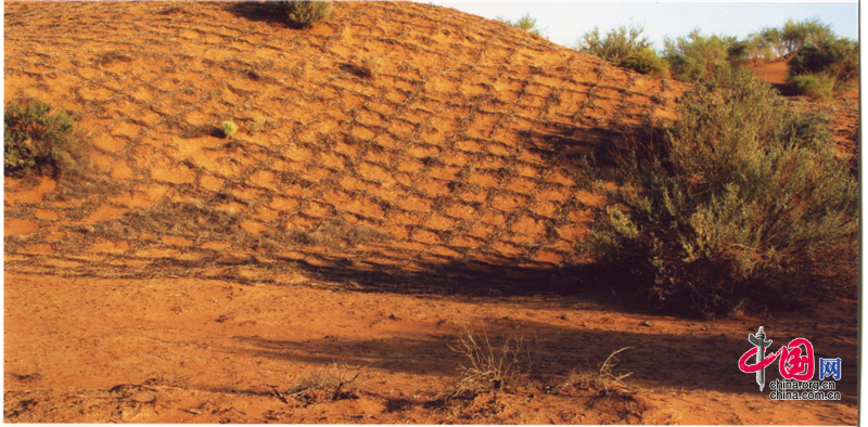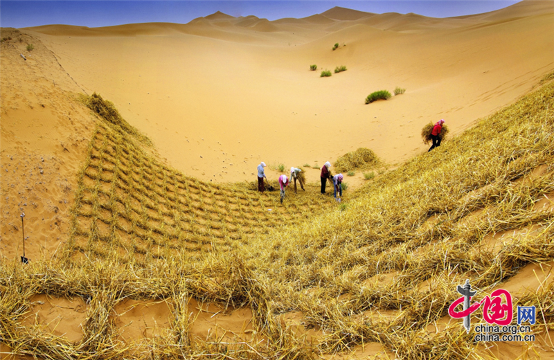 小小的“麥草方格”不僅阻止了流沙,防止了荒漠化,還加速了當(dāng)?shù)亟?jīng)濟(jì)的發(fā)展。“麥草方格”固沙法即:將廢棄的麥草呈方格狀鋪在沙面上,然后用鐵鍬軋進(jìn)沙中,留麥草的三分之一或一半立在四周,并在方格中植入治沙人經(jīng)九次試驗(yàn)成功培育出的花棒、檸條等沙生植物,腐爛干枯的麥草還作為肥料滋養(yǎng)植物的生長。