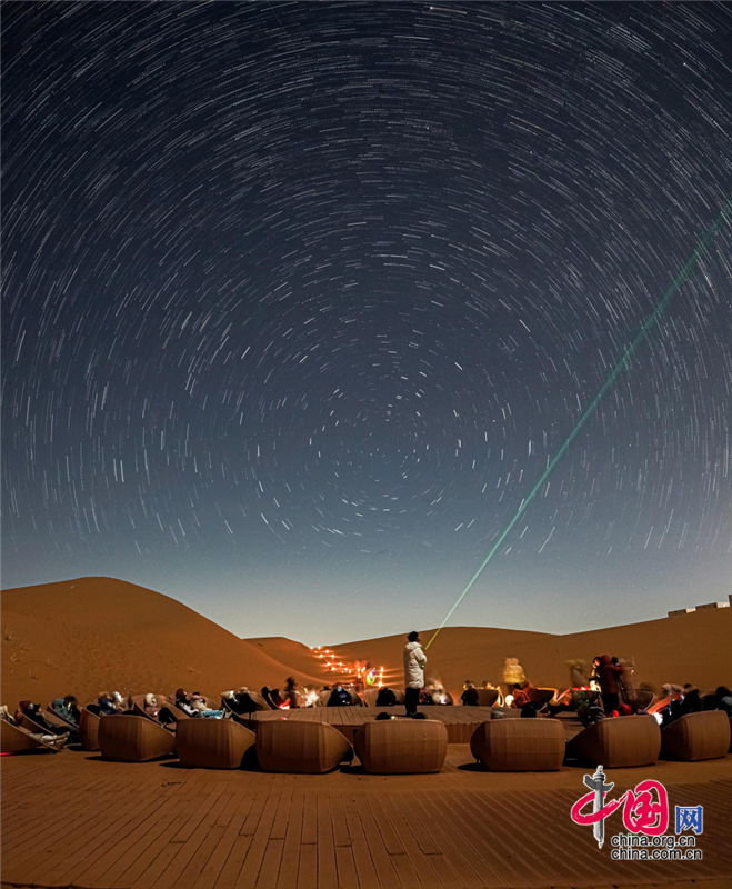 在沙漠區(qū),游客晨觀大漠日出,昏賞沙海夕陽,夜晚宿在星星酒店,感受躺在床上看星星的奇妙體驗(yàn),在星咖啡手工制作星星原木版畫,在五行沙療室滋養(yǎng)生命的每一個細(xì)胞,在觀星谷跟著星空講師春看獅子座、夏觀銀河、秋尋仙女座、冬追獵戶座,期待與一場流星雨的不期而遇。