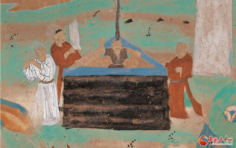 在宋代第55窟東壁門南側(cè)的金光明經(jīng)變右側(cè),有一幅壁畫,從上到下,將一個(gè)“流水長者子救魚”故事娓娓道來。