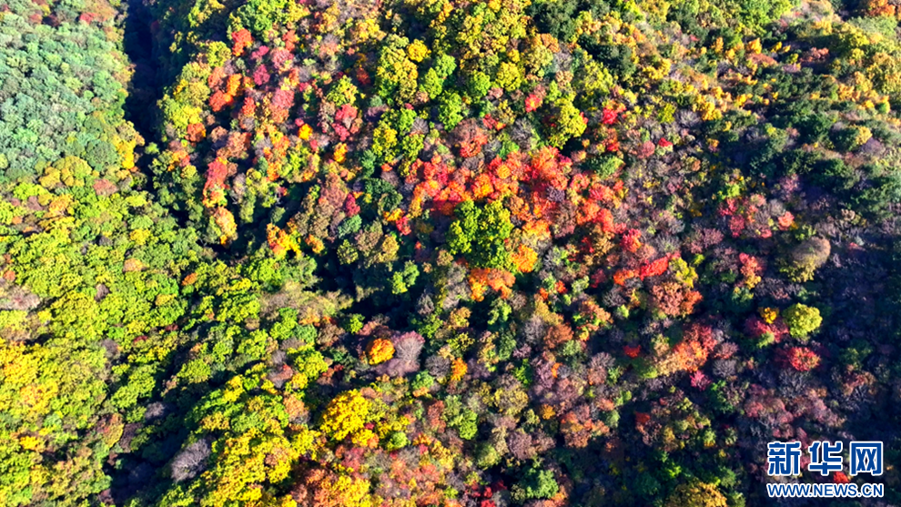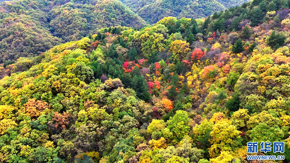 深秋時(shí)節(jié),甘肅省平?jīng)鍪谐缧趴h的唐帽山層林盡染,群山疊彩,勾勒出一幅絢麗多姿的美景圖。(圖片:高亮 文字:關(guān)改琴)
