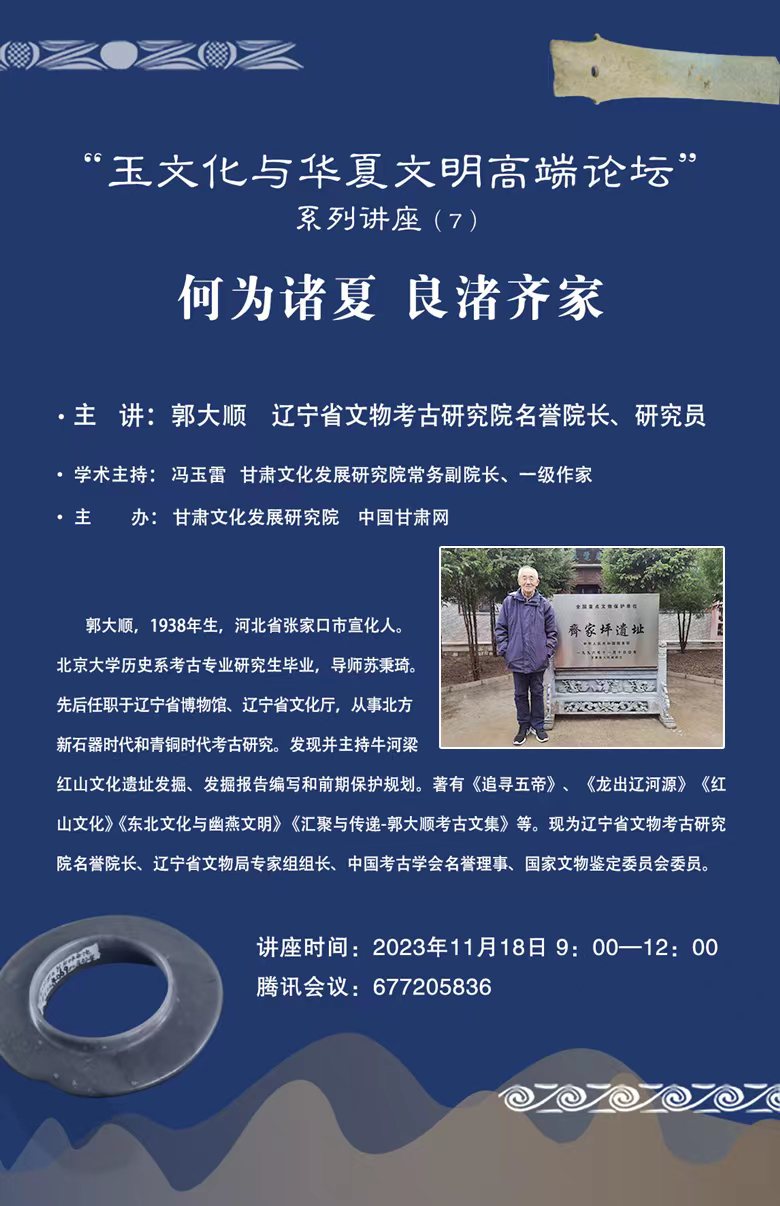 11月18日上午,遼寧省文物考古研究院名譽院長、遼寧省文物局專家組組長、中國考古學會常務理事郭大順研究員在線上做了題目《何為諸夏,良渚齊家》的學術報告。這是甘肅文化發(fā)展研究院和中國甘肅網聯合舉辦的“玉文化玉華夏文明高端論壇”系列講座第五講,由甘肅文化發(fā)展研究院常務院長、一級作家馮玉雷主持,西北師范大學公選課《中國玉文化》學子及鄧淑蘋、薛新明、徐琳、王方、韓斝等玉學家參會并討論。