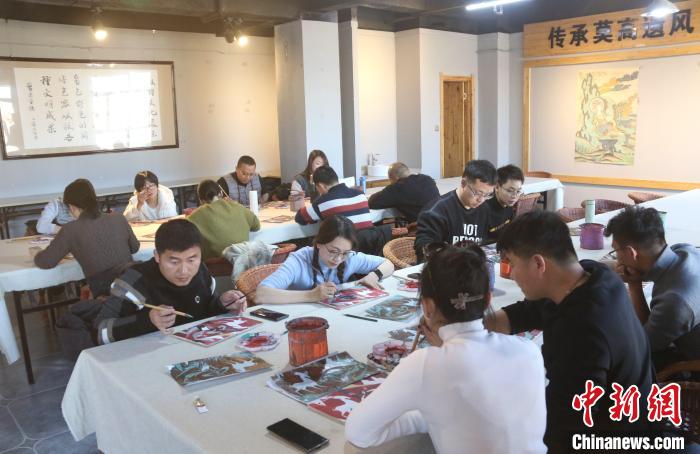 1月11日,來自云南的學員在甘肅敦煌小鎮(zhèn)鳴沙書院研學課堂學習臨摹敦煌壁畫。張曉亮 攝