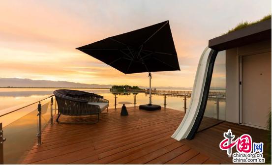 還有地球倉,與賀蘭山隔湖相望,超廣角的落地窗,猶如一個畫框,把房間外的風景都放進了畫框里。與其他不同的是,白天可將房間內(nèi)的自動升降床上升至房頂,露出隱藏在床底的沙發(fā)和茶桌,臥室即可秒變“會客茶室”。